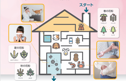 アレルギーを起こす物質のことを「アレルゲン」と言います。花粉やほこり(ハウスダスト)、食べ物など身の回りにある多種多様なものがアレルゲンになる可能性があります。