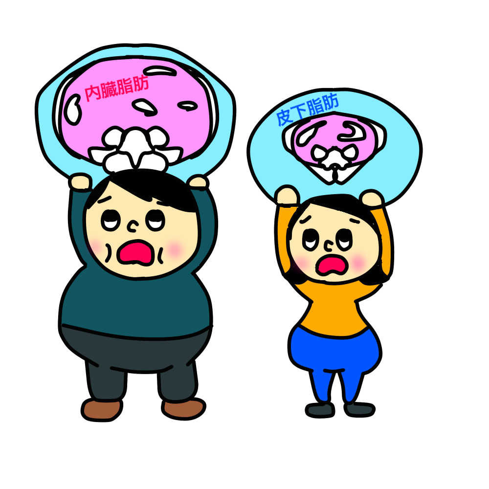 内臓脂肪と聞いて太っている人を想像した方が多いのではないでしょうか?確かにメタボリックシンドロームの必須診断基準に腹囲(男性は85㎝以上、女性は90㎝以上)があるように肥満体形の方が内臓脂肪を蓄えてしまっている可能性は高いです。しかし、筋肉質な男性などでは腹囲が90㎝以上あったとしても内臓脂肪がほとんどついていない方もいらっしゃいます。また、日本人は皮下脂肪が少なくても内臓脂肪を蓄えやすいと言われています。一概に体形=内臓脂肪が多いとは言えないのです。