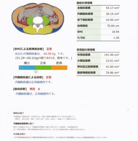 そこでCTを用いて腹部を輪切りにすることで、見た目ではわからない内臓脂肪を確認することができます。画像のように①皮下脂肪(青色)②内臓脂肪(赤色)③筋肉量(薄橙色、黄緑色、黄色)④腹囲⑤BMIを測定し、判断することができます。