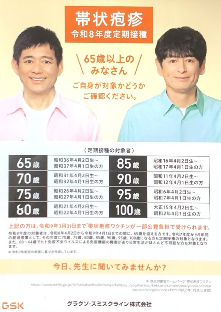 令和8年度も前年度同様、帯状疱疹ワクチンの定期接種が可能です。